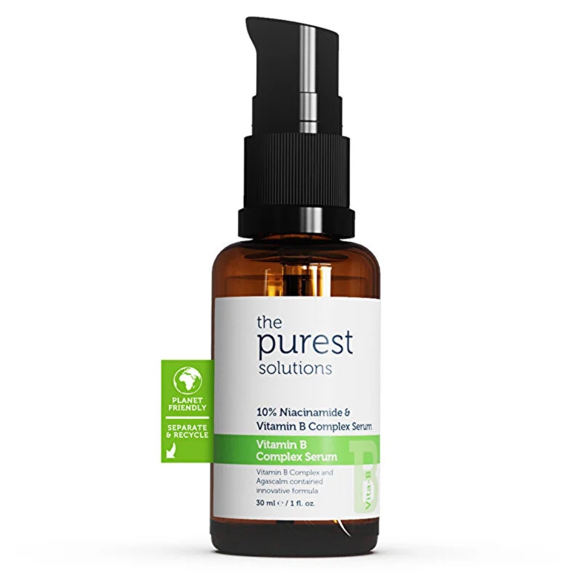 سيروم فيتا-ب كومبليكس لدعم تقوية الحاجز من The Purest Solutions هو سيروم مبتكر مكون من مزيج من النياسيناميد (فيتامين ب3) الذي يقوي الحاجز الجلدي، مع تأثير فيتامين ب المركب (ب1، ب2، ب5، ب6، ب7، ب9، ب12) الذي يساعد على تجديد البشرة، بالإضافة إلى تأثير أغاسكالوم المهدئ الذي يقدم تأثيرًا مضادًا للتحسس، مضادًا للإحمرار وعمليًا في تجديد البشرة. كما أن تركيبة السيروم التي تحتوي على بانثينول، توكوفيرول و Hyaluronic Acid 4D تساعد في توفير توازن رطوبة البشرة.